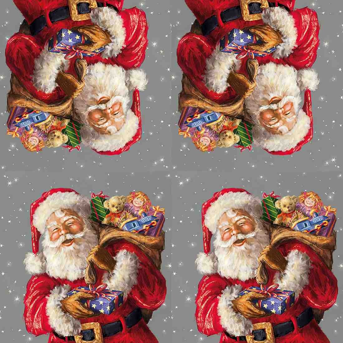 The attached decoupage paper napkin features a classic, cheerful Santa Claus illustration. Santa is depicted with a warm, jolly expression, rosy cheeks, and his signature white, fluffy beard. He wears a vibrant red suit trimmed with white fur and holds a star-patterned gift wrapped with a red ribbon in his gloved hands. Draped over his shoulder is a sack brimming with toys, including a teddy bear, a doll, a toy car, and wrapped presents. The background is a soft gray adorned with twinkling stars, adding a festive and magical ambiance. This design is perfect for Christmas crafts, decorations, or holiday-themed projects.