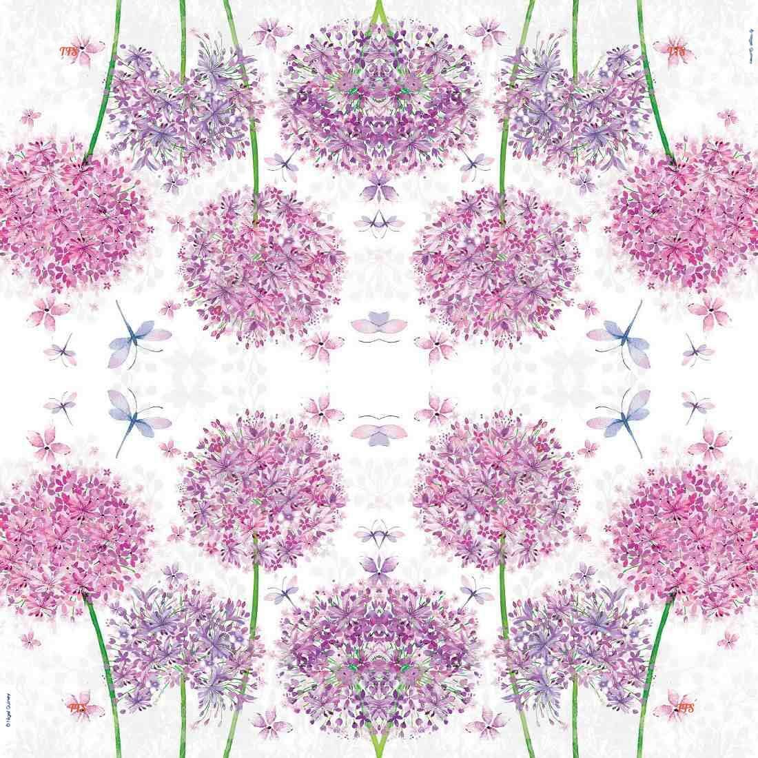 This decoupage tissue paper features elegant allium flower heads illustrated in a soft watercolor style. The design shows rounded floral clusters composed of delicate pink and lilac petals, balanced on tall green stems, with light butterflies fluttering around to add movement and charm. Set against a clean white background, the artwork feels airy, graceful, and contemporary while retaining a romantic floral appeal. This floral decoupage paper is ideal for use on wooden trays, furniture panels, boxes, glass jars, bottles, lamps, and decorative accents. Its balanced layout allows it to work beautifully as a full-surface application or as individual cut-out motifs for layered designs.