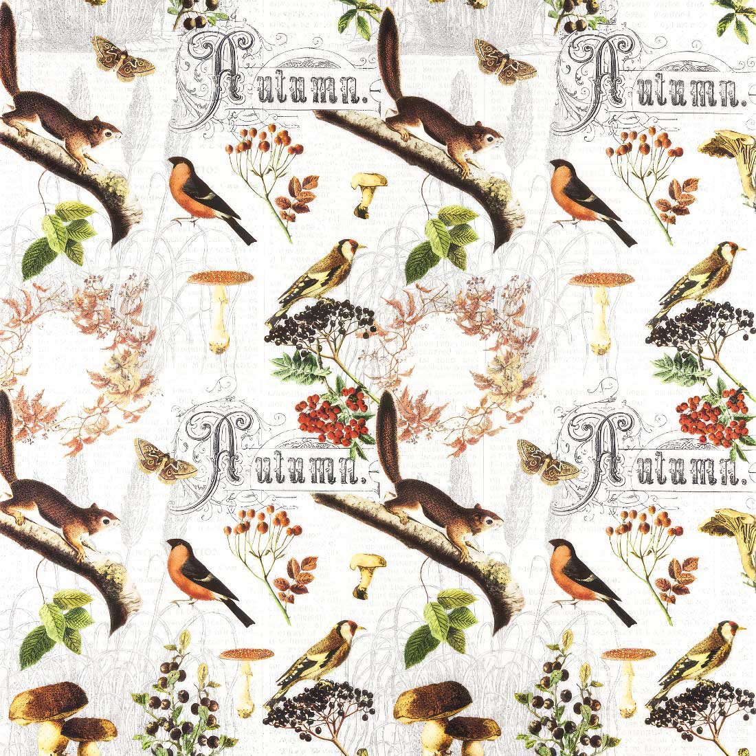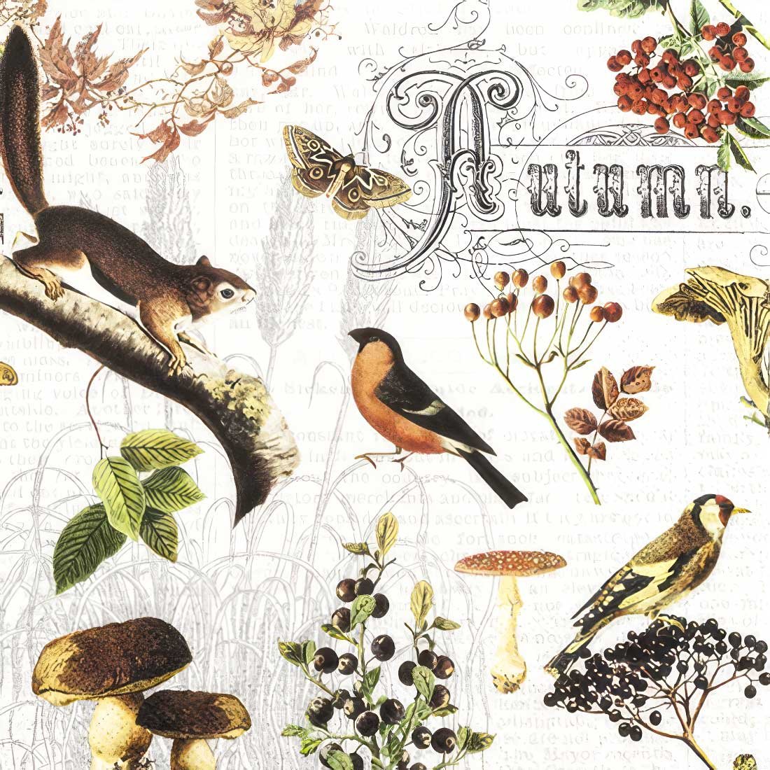 This artistic decoupage paper napkin showcases a richly detailed autumn collage featuring woodland birds, a squirrel, mushrooms, berries, butterflies, and foliage.