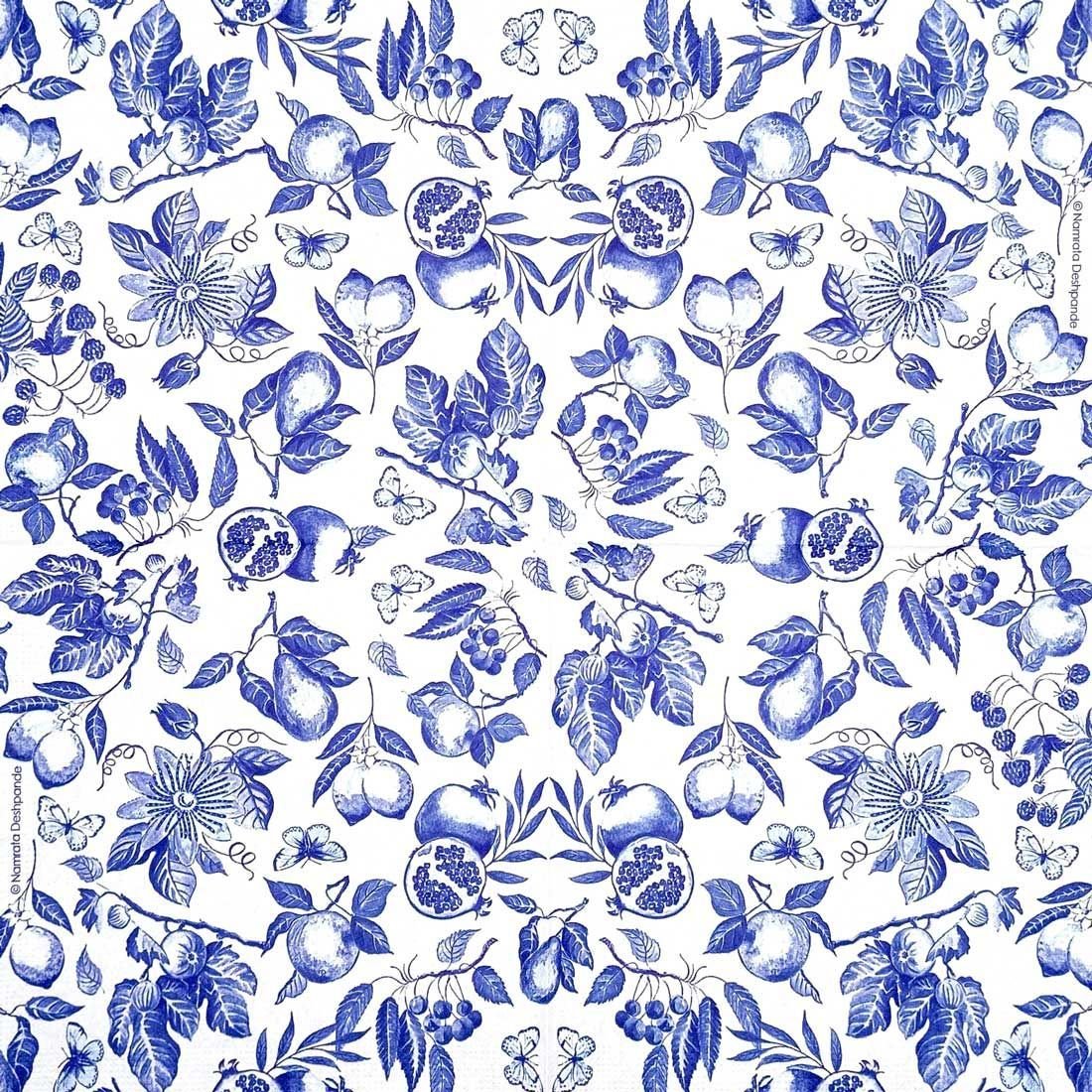 Add a touch of timeless elegance to your crafts with this beautiful “Blue Toile” decoupage tissue paper. This sophisticated design features a classic toile pattern in a rich shade of blue, showcasing a variety of intricate botanical elements. The paper is adorned with delicate butterflies, luscious pomegranates, passionflowers, and berries, all rendered in a detailed, artistic style. This design is perfect for creating a chic, vintage look.