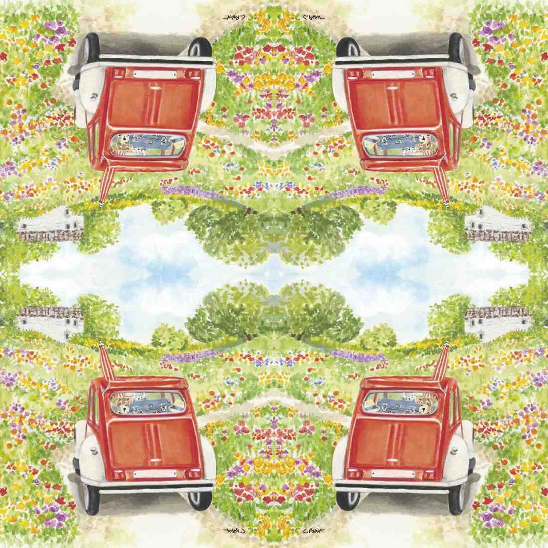 Bring a touch of playful charm to your crafts with this delightful decoupage napkin featuring a red vintage car driving through a colorful meadow of wildflowers. With adorable dogs and a cat enjoying the ride, this vibrant watercolor-style design evokes the carefree spirit of a countryside getaway. Perfect for travel-themed projects, pet lovers, or adding a fun twist to DIY décor.
