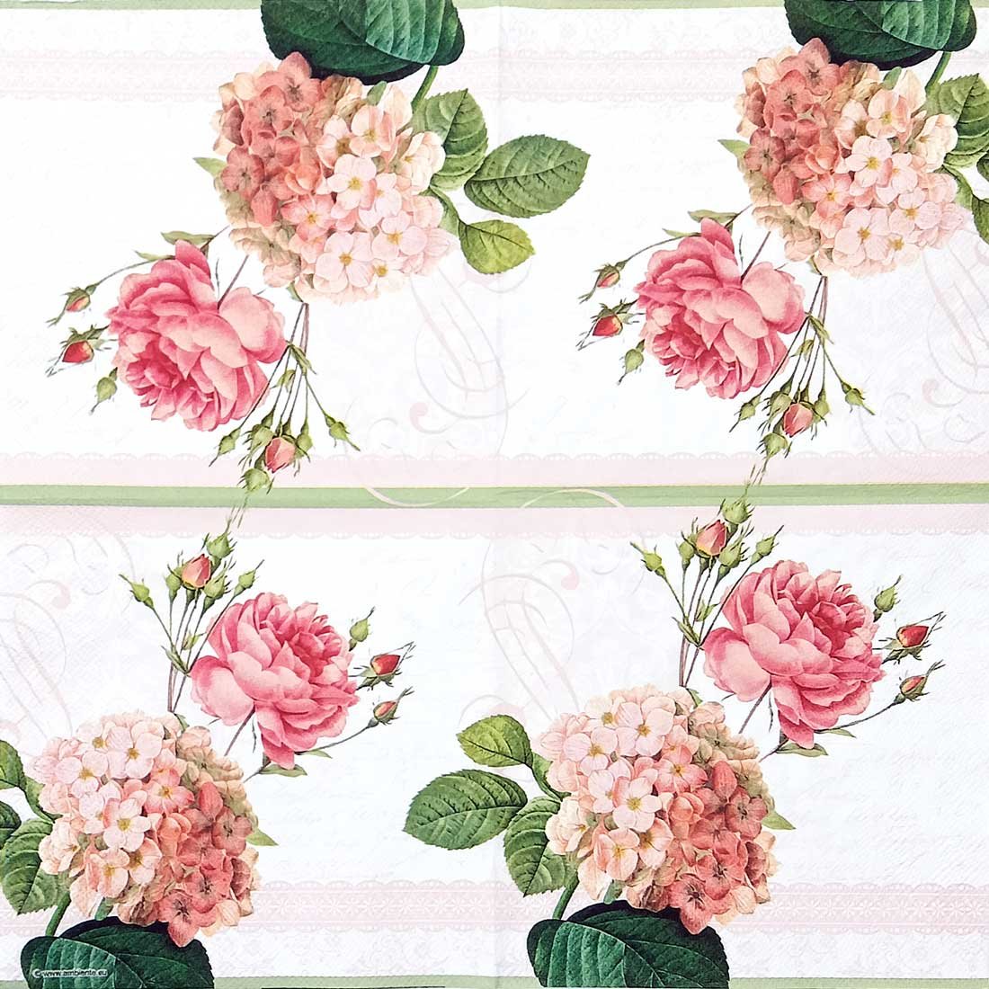 This elegant decoupage paper napkin showcases a romantic arrangement of soft pink roses paired with a delicate peach hydrangea cluster.
