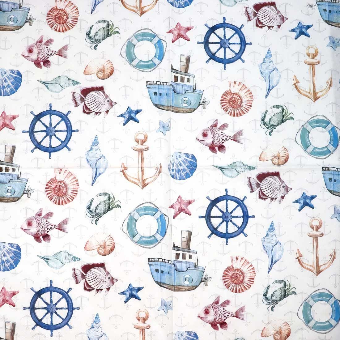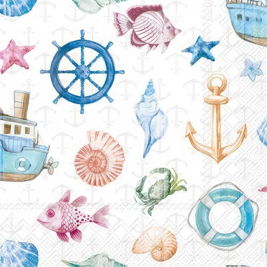 Bring a touch of the seaside to your crafts with this adorable decoupage napkin. Features a playful design of colorful seashells, fish, anchors, ship wheels, and boats against a subtle anchor background. Ideal for decoupage on wood, glass, and more.