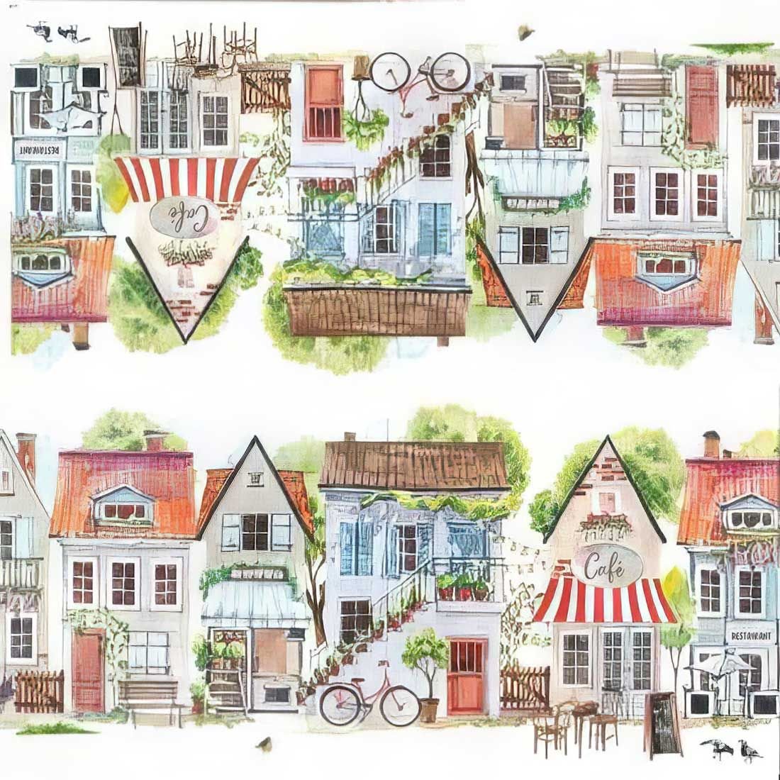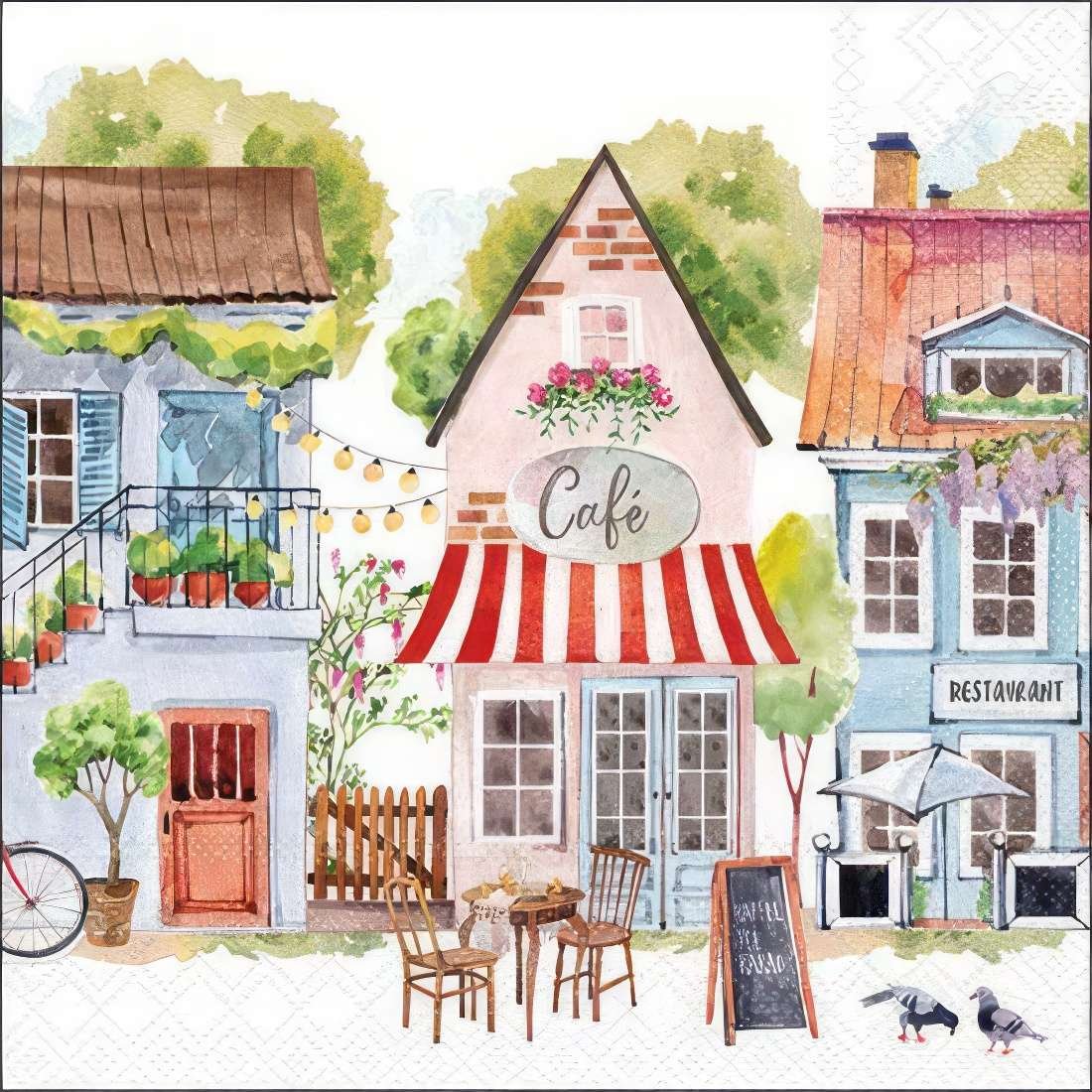 This whimsical decoupage napkin features a picturesque street scene with a cozy café in the center, flanked by quaint buildings with vibrant facades. The delicate watercolor style captures the essence of a serene European village, complete with outdoor seating, blooming flowers, and string lights that create a warm, inviting ambiance. Perfect for adding a touch of rustic charm to your DIY crafts and decoupage projects.