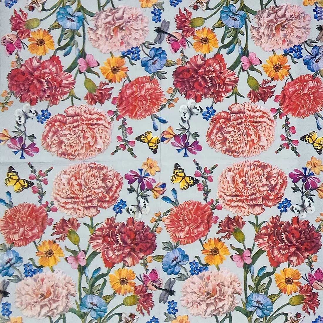 Add a burst of color and elegance to your craft projects with this Vibrant Garden Floral Decoupage Paper Napkin. The design showcases a lush bouquet of flowers — featuring pink and red carnations, yellow daisies, blue wildflowers, and delicate lavender blooms, all surrounded by green leafy stems.