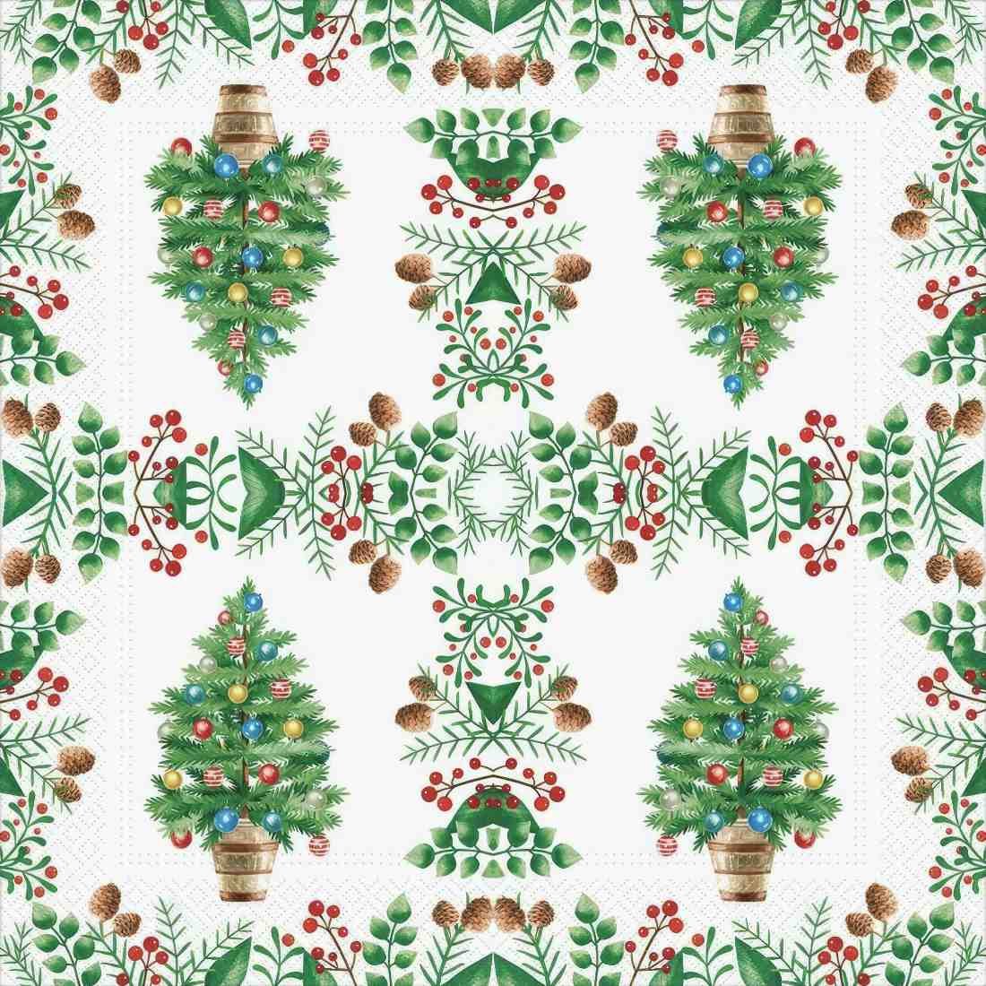 Featuring a charming decorated Christmas tree adorned with colorful ornaments in a rustic wooden pot, surrounded by a vibrant border of holly leaves, berries, and pinecones. This elegant and cheerful design is ideal for holiday-themed crafts or seasonal décor, bringing the spirit of Christmas to your projects.