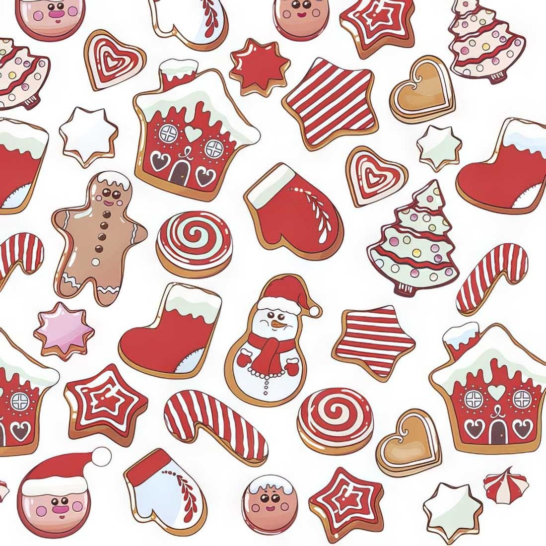 Celebrate the joy of holiday baking with this adorable tissue paper featuring a delightful assortment of decorated gingerbread cookies. The playful design includes smiling gingerbread men with icing details, charming gingerbread houses with snow-capped roofs and festive decorations, candy canes with classic red and white stripes, Christmas trees adorned with colorful sprinkles, cozy mittens and stockings, cheerful snowmen, hearts, stars, and swirled peppermint candies. The red, white, and brown color palette with touches of pastel icing creates a sweet, nostalgic feel perfect for decoupage projects
