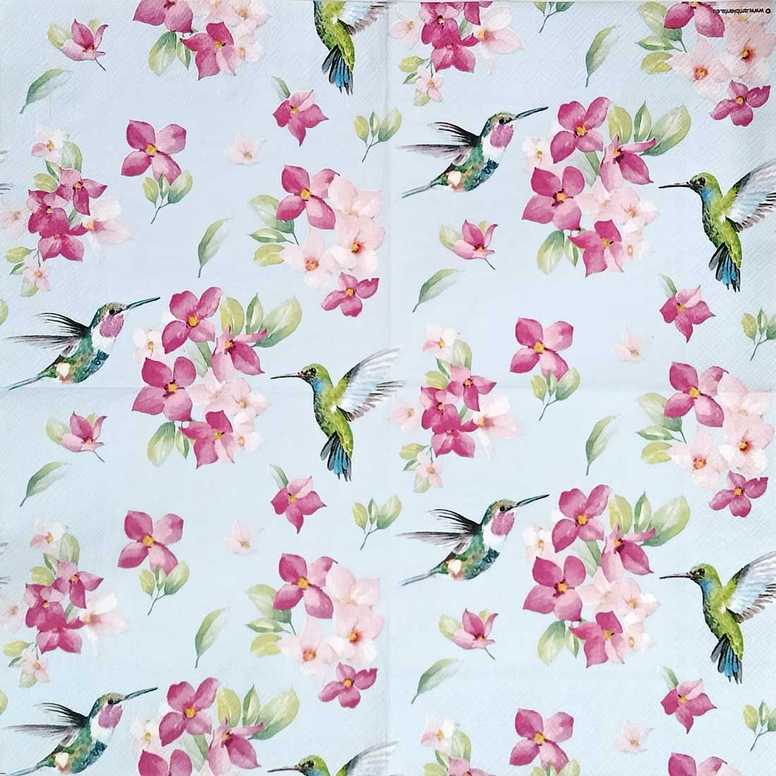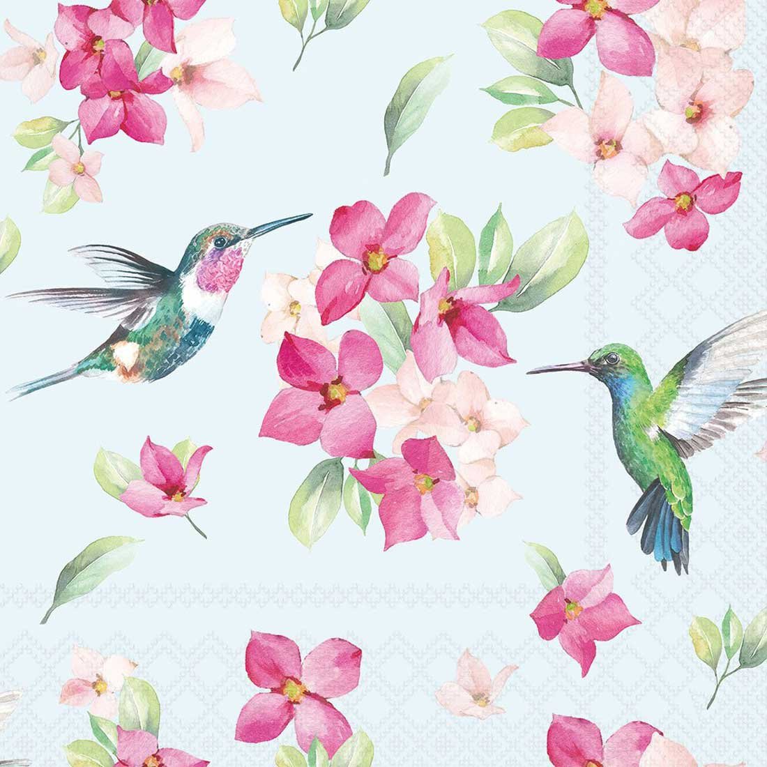 This charming decoupage paper napkin features vibrant hummingbirds hovering around delicate pink and blush orchid blooms. Painted in a soft watercolor style, the composition sits on a gentle pastel blue background that enhances the freshness of the design. The detailed birds with shimmering green and teal tones add movement and life, making this print lively and eye-catching.