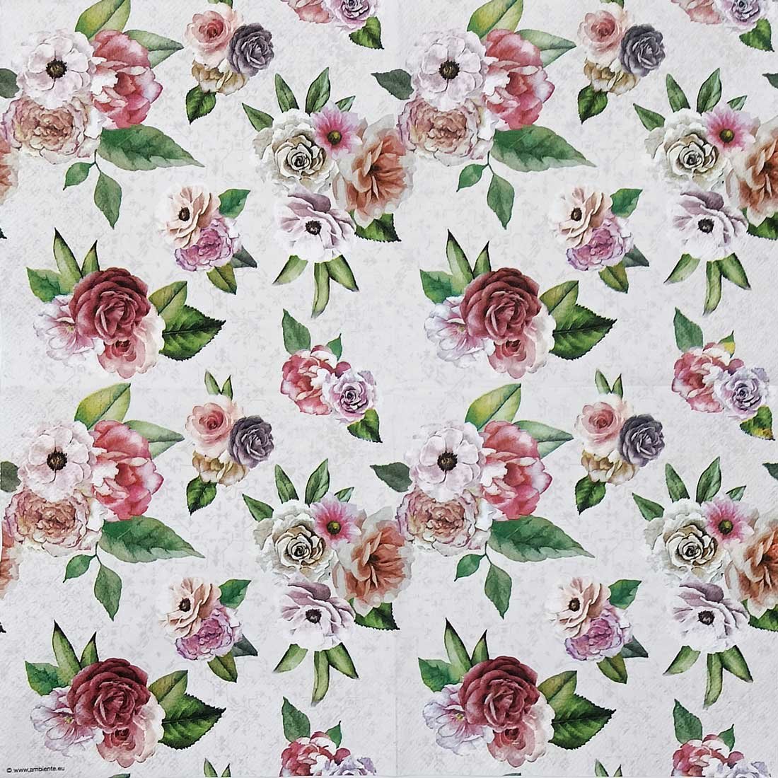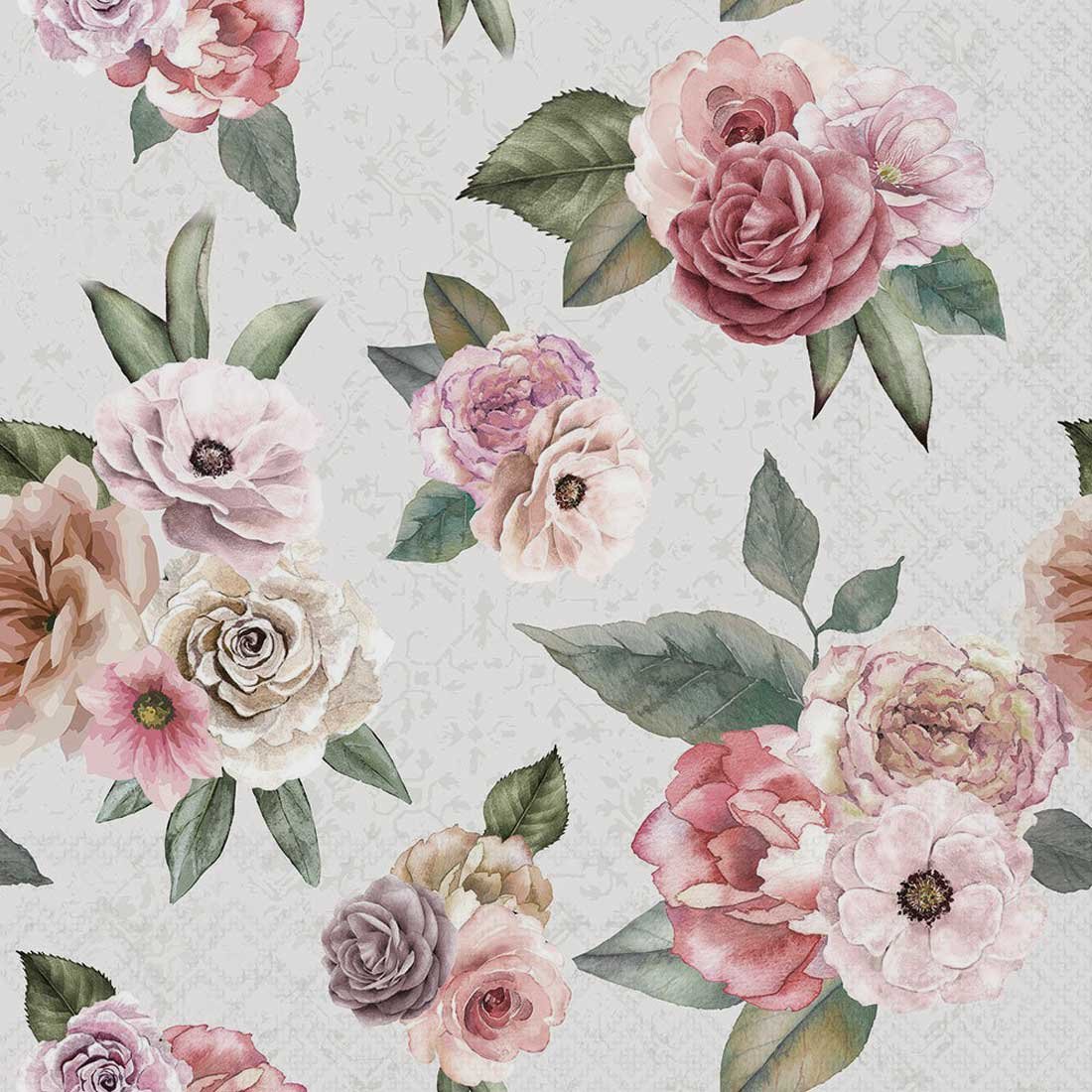 This refined decoupage paper napkin displays an elegant arrangement of roses, peonies, and anemone-style blooms in muted blush, mauve, and dusty pink tones. The watercolor botanical illustration style gives the flowers a soft, romantic finish, while the pale patterned background adds subtle texture.