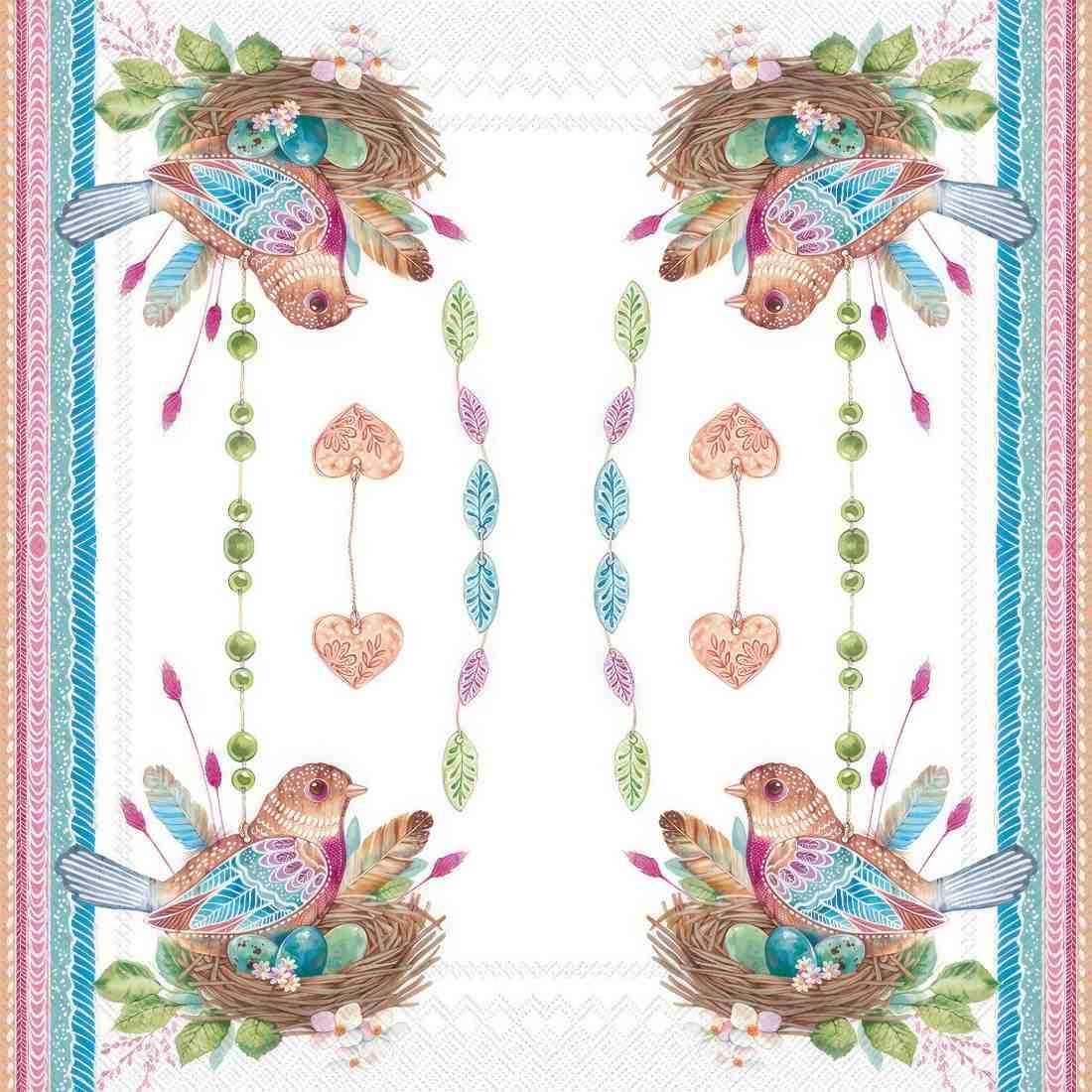 Add a touch of folk-art charm to your crafts with this beautiful decoupage paper napkin, featuring a decorative bird nestled in a cozy nest with speckled blue eggs, feathers, and delicate florals. Accented with hanging heart and leaf ornaments and colorful border details, this design is perfect for spring, Easter, and nature-inspired DIY projects.