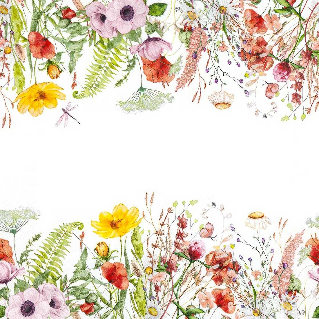 Bring the beauty of a blooming summer meadow to your creative projects with this stunning decoupage paper napkin. Featuring a naturalistic array of wildflowers – poppies, daisies, anemones, and ferns, this design captures the charm of untamed nature in soft, watercolor-inspired detail. The mix of warm yellows, earthy reds, and lush greens set against a white background adds a fresh, organic feel to any surface. Ideal for rustic décor, nature-themed crafts, and floral mixed media art.
