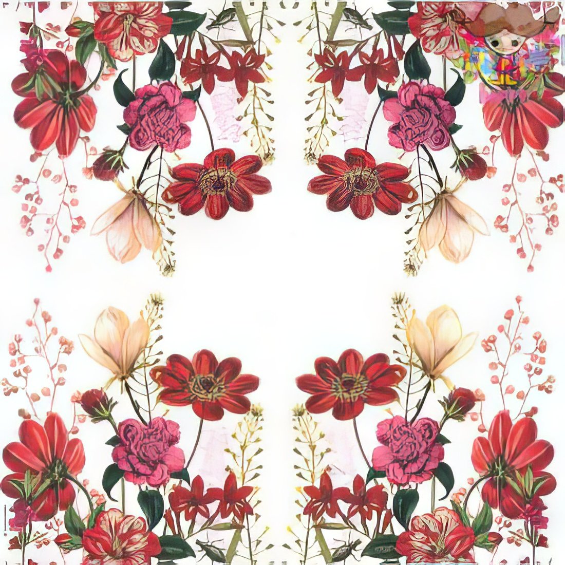 This decoupage paper napkin features a vibrant and elegant floral design. It showcases an array of flowers in various shades of red, pink, and yellow, with intricate detailing and realistic textures. The central focus includes a mix of blossoms, such as daisies, peonies, and lilies, surrounded by delicate leaves and buds. The background is a clean white, allowing the vivid colors of the flowers to stand out, making it a perfect choice for adding a touch of nature and sophistication to any project.