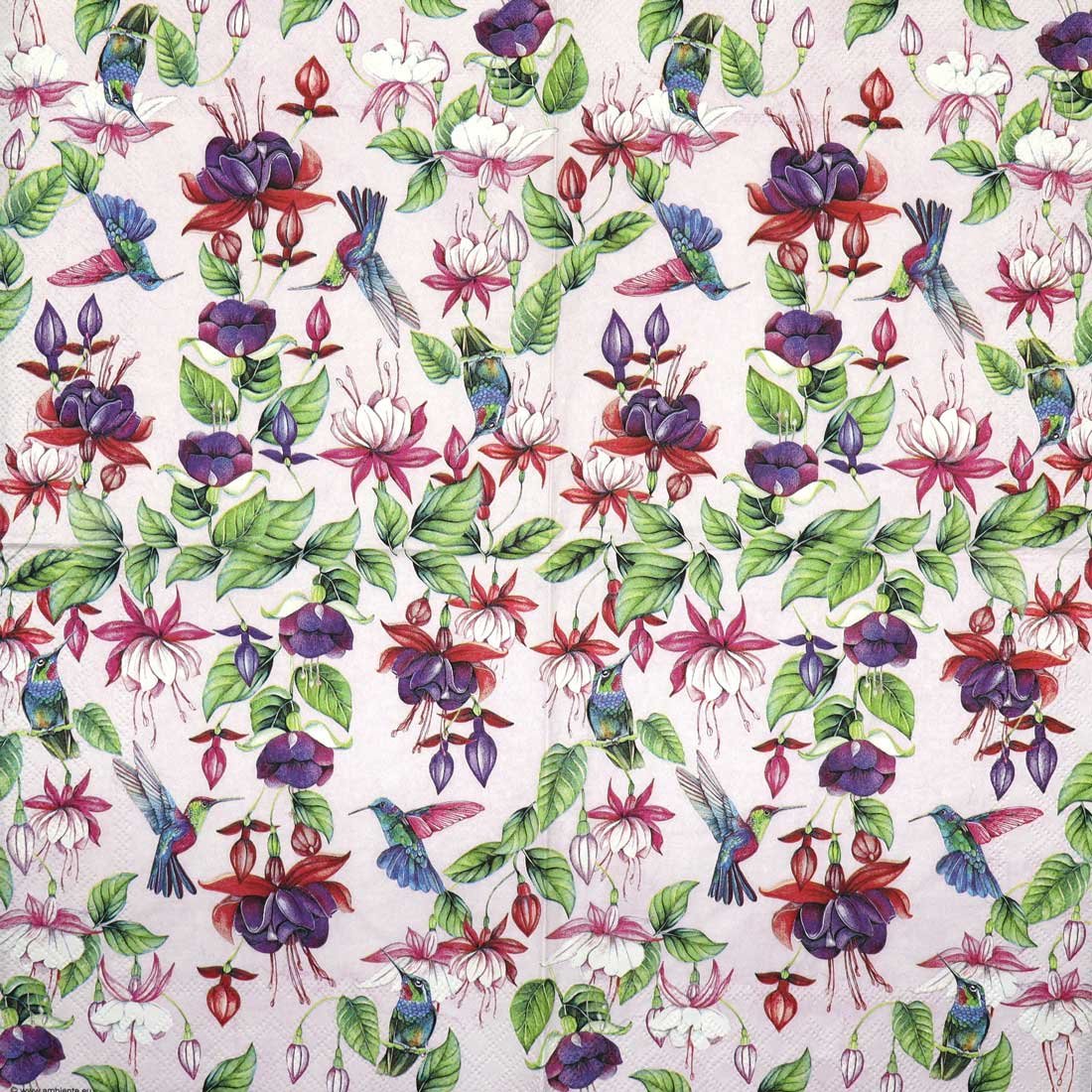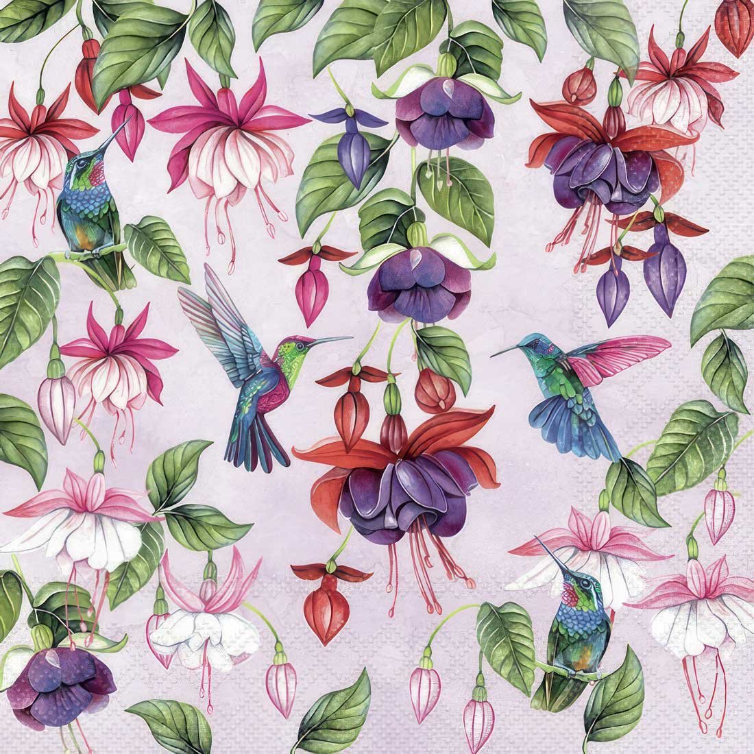 This decoupage paper napkin features a vibrant and elegant design of fuchsia flowers intertwined with lush green leaves. Among the flowers, beautifully detailed hummingbirds in shades of green, blue, and pink are delicately hovering, adding a sense of life and movement to the scene. The background is a soft, pastel pink, which enhances the colors of the flowers and birds, making them stand out even more. This design is perfect for crafting projects that aim to capture the beauty of nature and the grace of these tiny, colorful birds.
