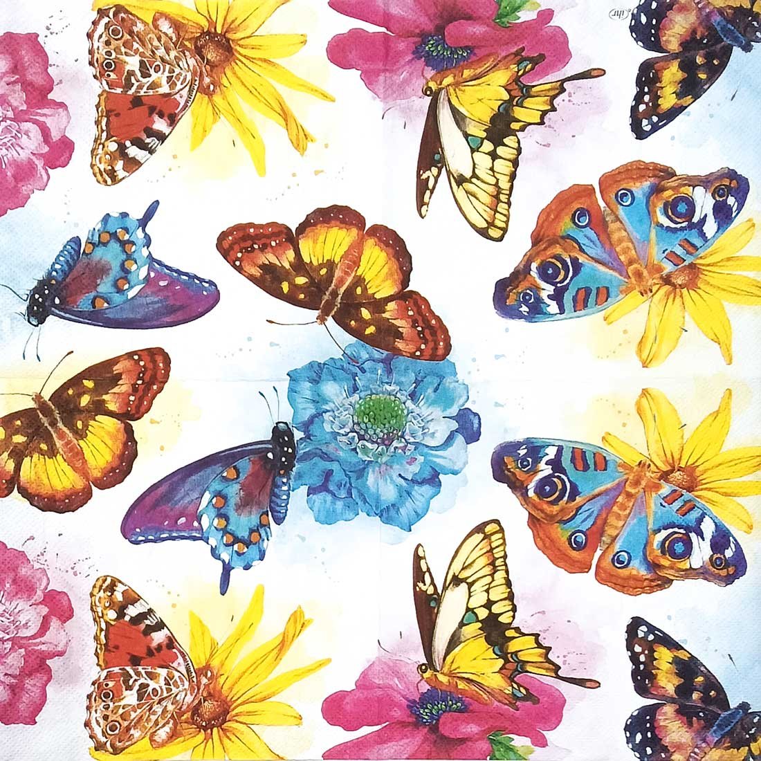 This vibrant decoupage paper napkin features a lively garden scene filled with beautifully illustrated butterflies resting among blooming flowers.