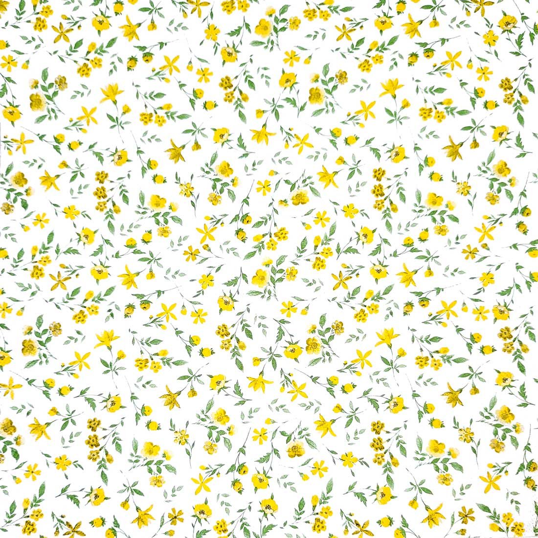 Add a touch of elegance and charm to your next craft project with this beautiful decoupage paper napkin. Featuring a delicate pattern of yellow flowers with lush green leaves set against a crisp white background, this napkin exudes a sense of fresh, floral beauty. Perfect for spring and summer gatherings, DIY crafts, or decorative purposes, the intricate floral design and vibrant colors will bring a delightful, natural feel to any setting. Ideal for decoupage enthusiasts, this napkin is a wonderful choice for adding a touch of nature-inspired artistry to your creations.