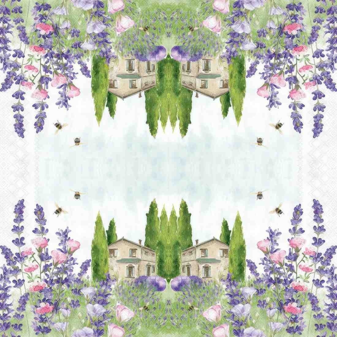 Capture the beauty of the French countryside with this stunning decoupage napkin, featuring a charming rustic farmhouse nestled among rolling lavender fields. Delicate pink and purple wildflowers bloom in the foreground, while buzzing bees bring a lively touch of nature. Tall cypress trees frame the serene landscape, evoking the peaceful essence of Provence. This elegant watercolor design is perfect for enhancing trays, coasters, wooden furniture, and craft projects with a soft, vintage charm. Bring a breath of fresh countryside air to your creations with this delightful floral napkin!