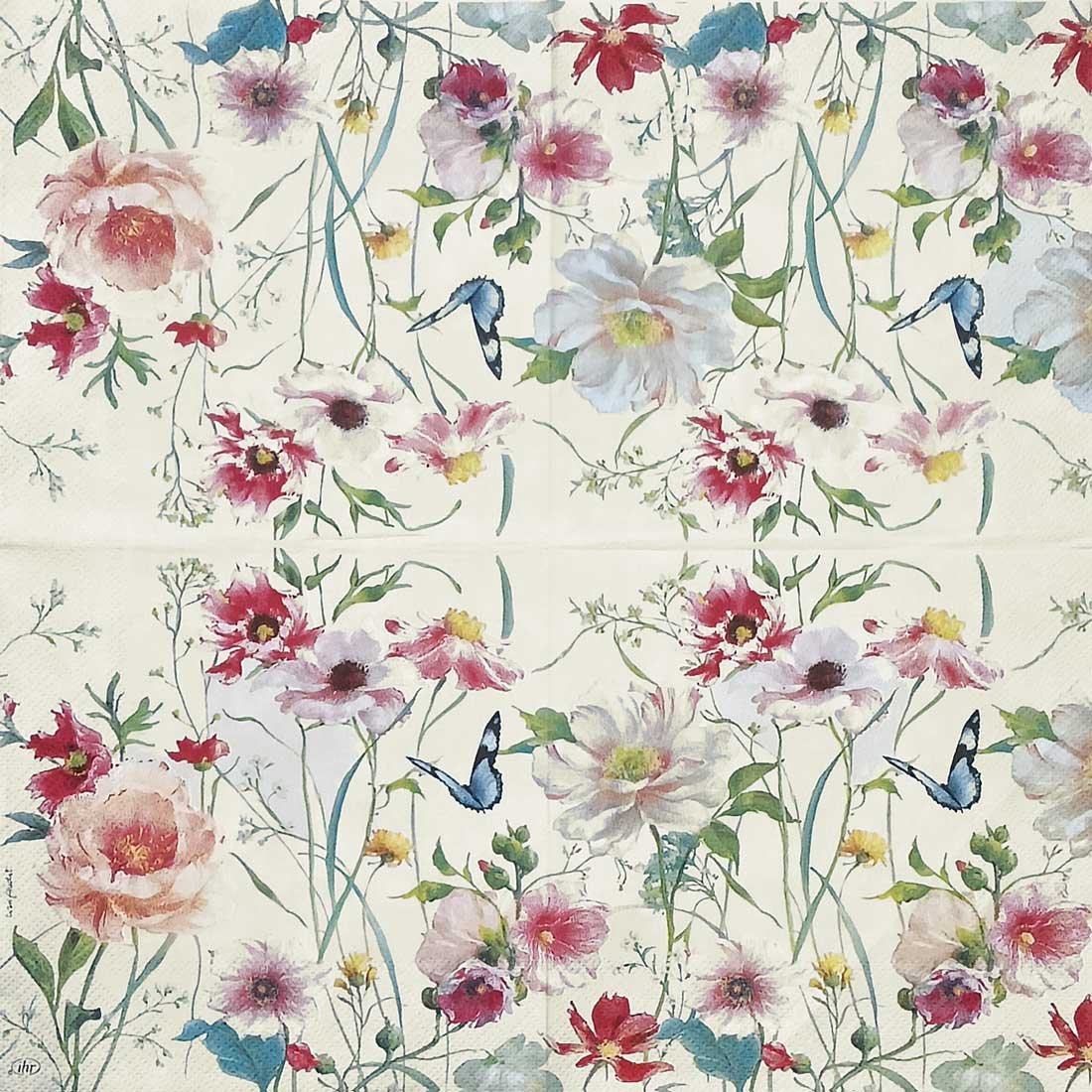 This elegant decoupage paper napkin features a graceful arrangement of blooming wildflowers illustrated in a soft, airy watercolor style.