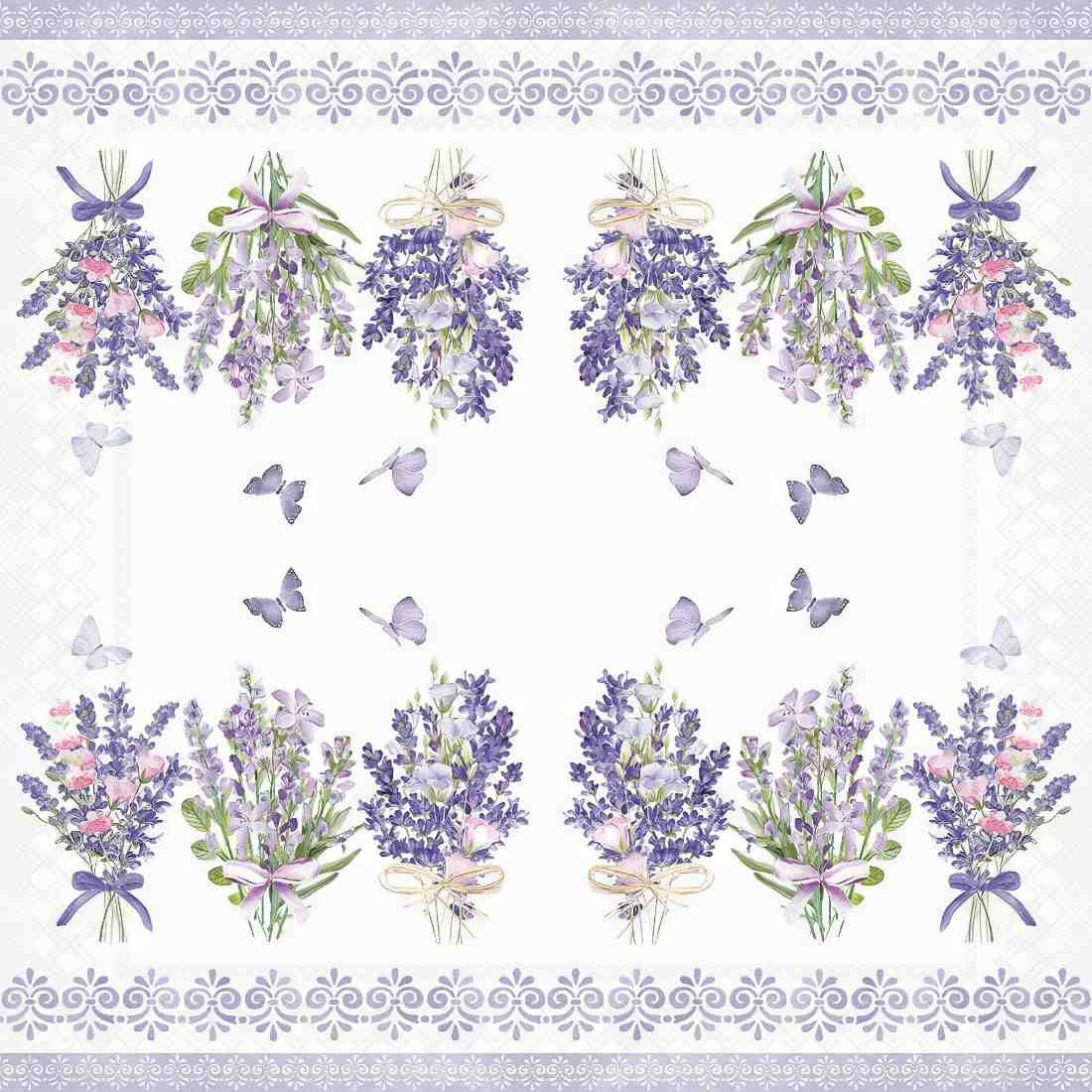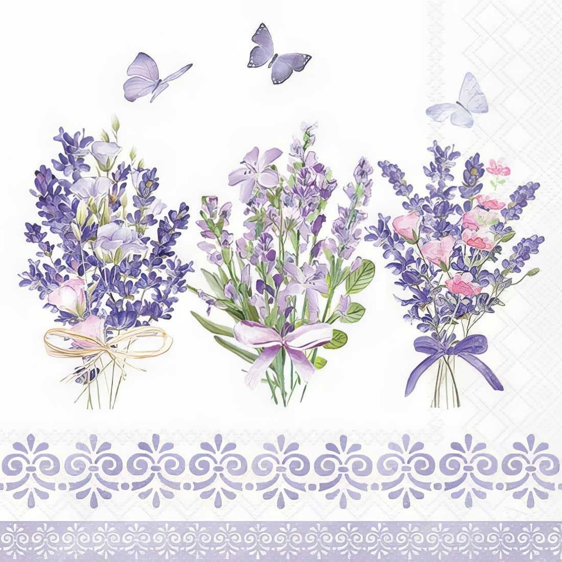 This decoupage napkin features a charming design of three lavender bouquets tied with ribbons, interspersed with delicate butterflies. The bouquets are rendered in soft purples and greens, creating a soothing and elegant aesthetic. The bottom of the napkin is adorned with a decorative pattern of repeating floral-like motifs, adding a touch of sophistication. This napkin is perfect for adding a touch of floral beauty to your craft projects.