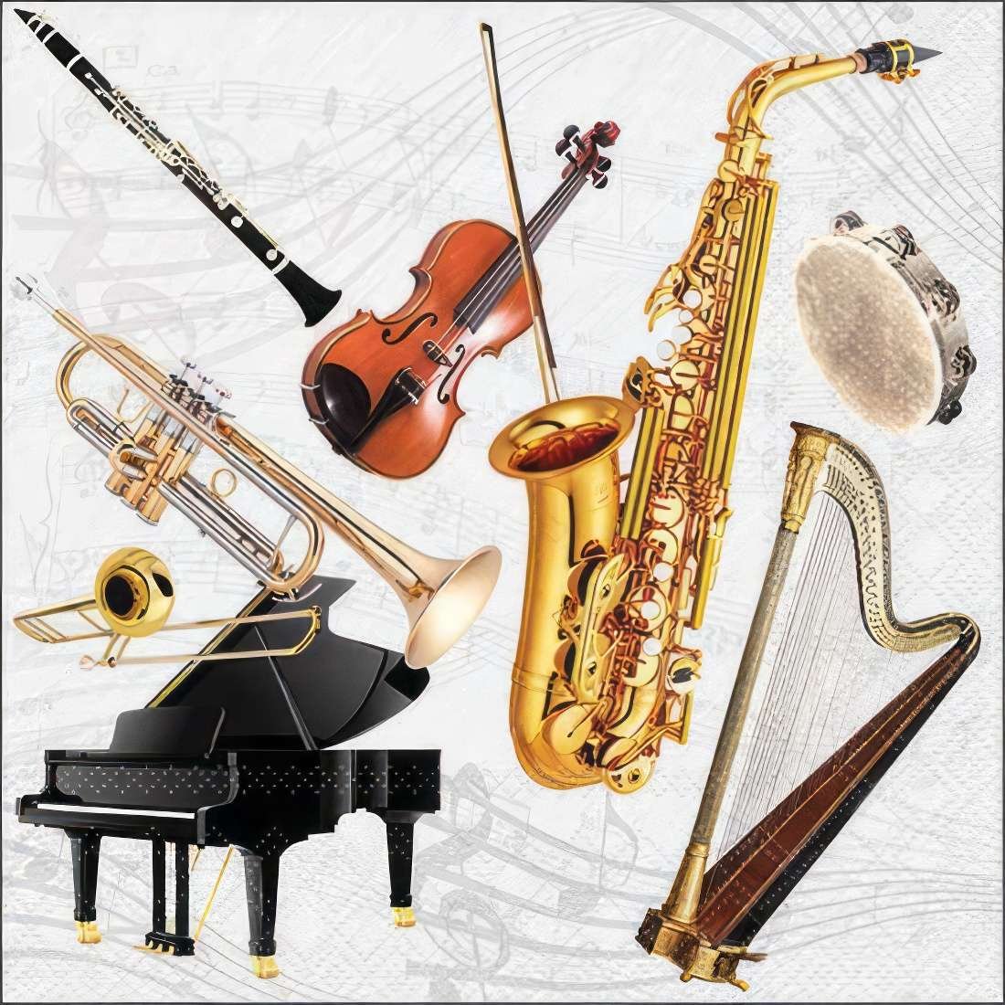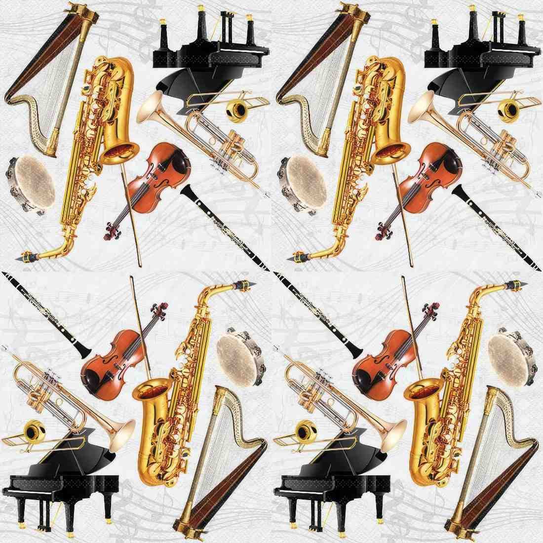 This elegant decoupage paper napkin features a beautifully detailed arrangement of musical instruments, including a saxophone, violin, trumpet, clarinet, tambourine, harp, and grand piano. Set against a subtle background of musical notes and sheet music, the design exudes a sense of harmony and sophistication. The golden tones of the brass instruments contrast beautifully with the rich wood textures of the stringed instruments, making this napkin perfect for music lovers, themed events, and creative craft projects celebrating the joy of music.