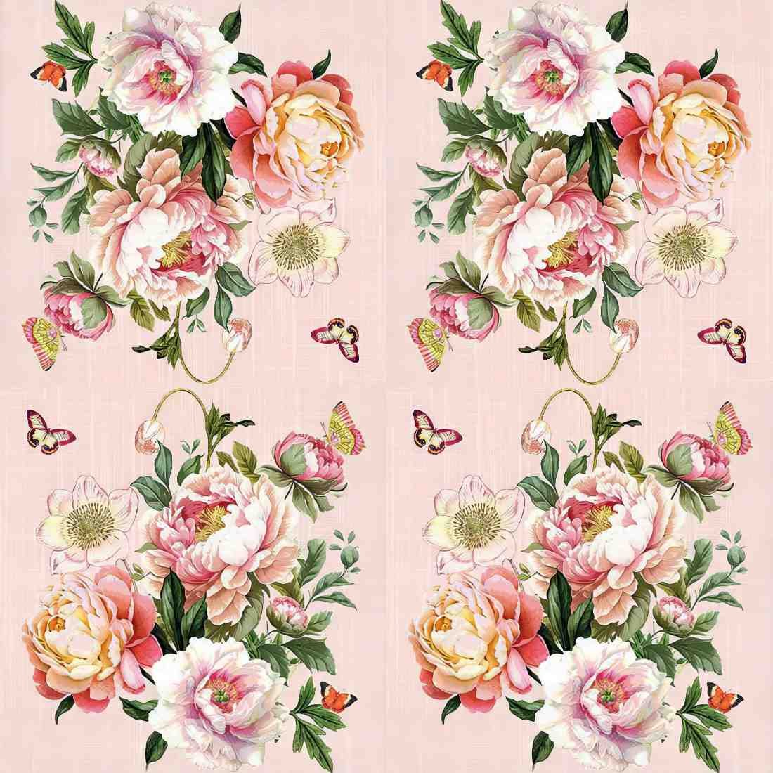 This exquisite decoupage paper napkin features a lush bouquet of peonies in soft pastel shades of pink, peach, and ivory, beautifully accented with rich green foliage. Delicate butterflies flutter around, adding a whimsical charm to the elegant floral composition. Set against a subtle textured blush background, this napkin is perfect for decoupage, crafting, scrapbooking, and elegant table settings. A timeless design that brings a touch of vintage floral beauty to any creative project.