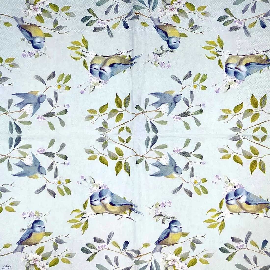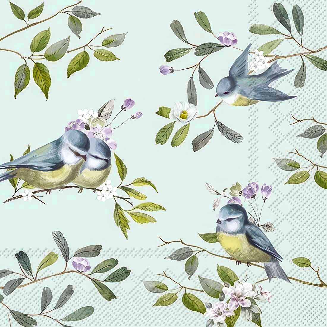 This decoupage paper napkin showcases a delicate and serene design featuring blue and yellow songbirds perched on branches adorned with soft blossoms and green leaves. Set against a pale pastel blue background, the artwork exudes a peaceful, springtime charm, perfect for crafting, table settings, or decorative projects that evoke a sense of natural beauty and tranquility.