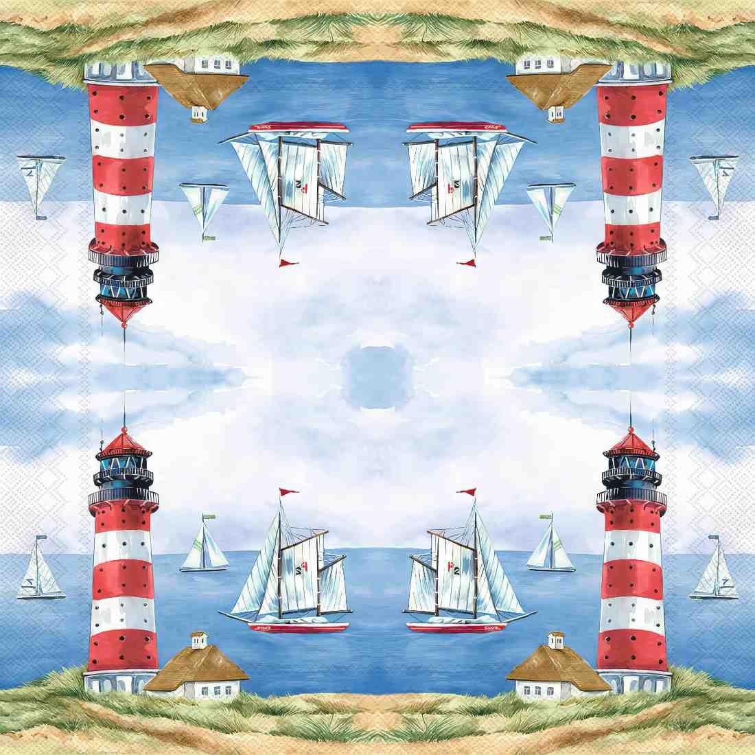 This decoupage paper napkin features a vibrant seaside scene with a bold red-and-white striped lighthouse standing tall on a sandy grassy dune. The tranquil blue sea is adorned with elegant sailboats, their colorful sails fluttering in the breeze. A quaint coastal cottage nestles near the lighthouse, completing the idyllic maritime landscape. This cheerful and bright design is perfect for nautical-themed crafts and home decor.