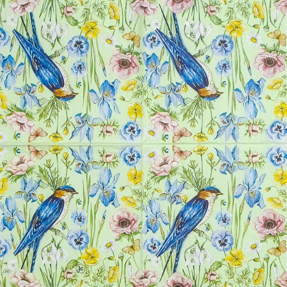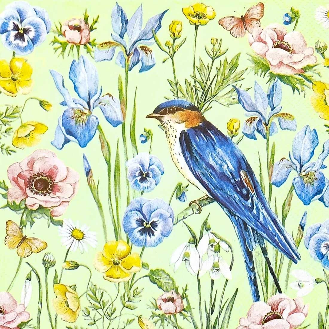 Celebrate the joy of spring with this delightful decoupage napkin featuring a vivid bluebird perched among a meadow of blooming wildflowers. Set against a cheerful light green background, the design showcases delicate pansies, irises, anemones, and daisies in soft pastel hues, along with fluttering butterflies that add to its whimsical charm. Perfect for nature-inspired craft projects, Easter decor, and cheerful seasonal settings, this napkin brings a fresh burst of color and tranquility to any creation.
