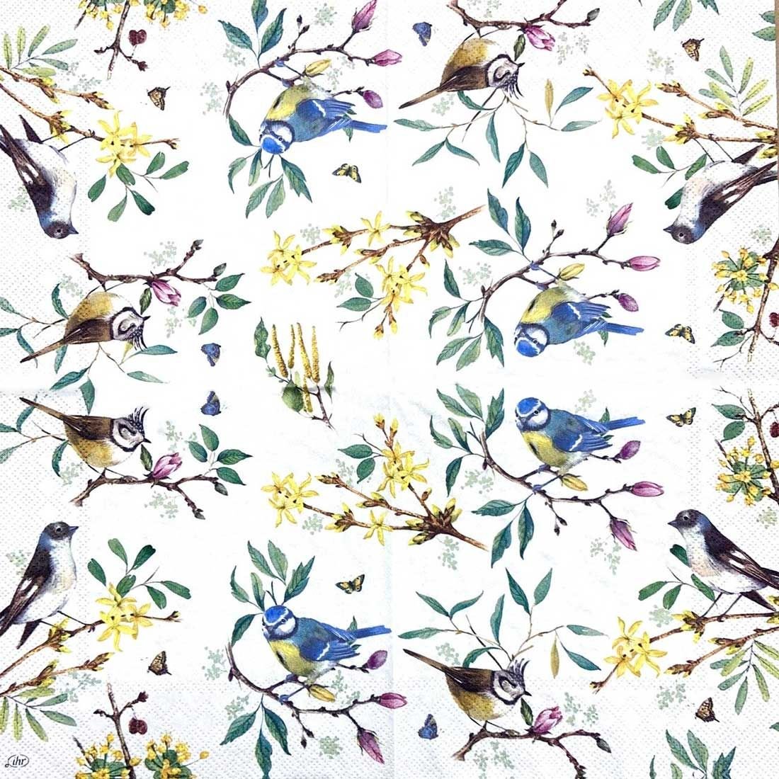 Delight in the charm of springtime with this beautifully illustrated decoupage paper napkin featuring a whimsical scene of colorful songbirds perched among blooming flowers and fluttering butterflies. With soft pastels and intricate botanical details, it’s perfect for shabby chic crafts, nature-inspired decor, and seasonal DIY projects.