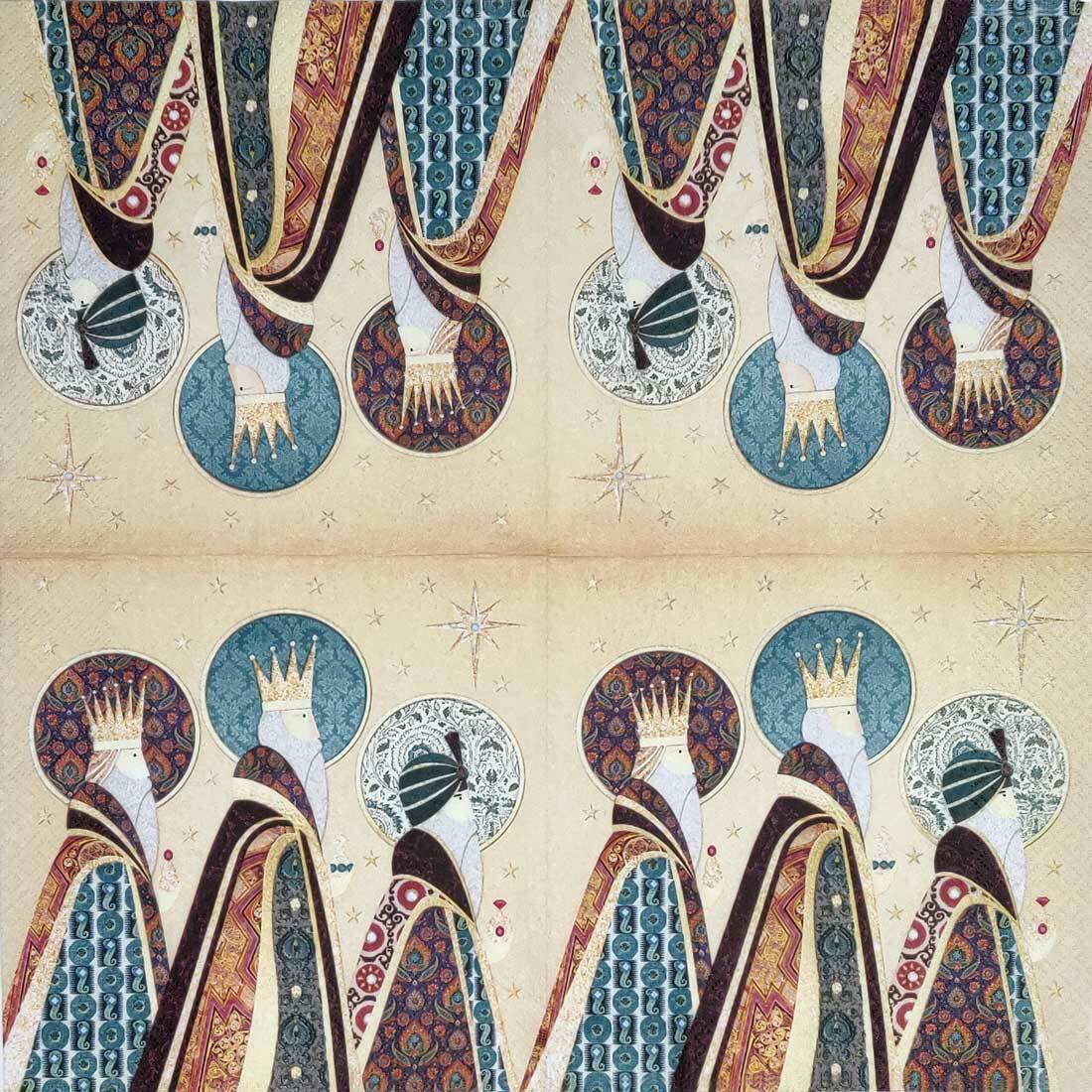 This elegant decoupage paper napkin features a refined artistic depiction of the Three Kings, inspired by classic Nativity and Epiphany artwork.
