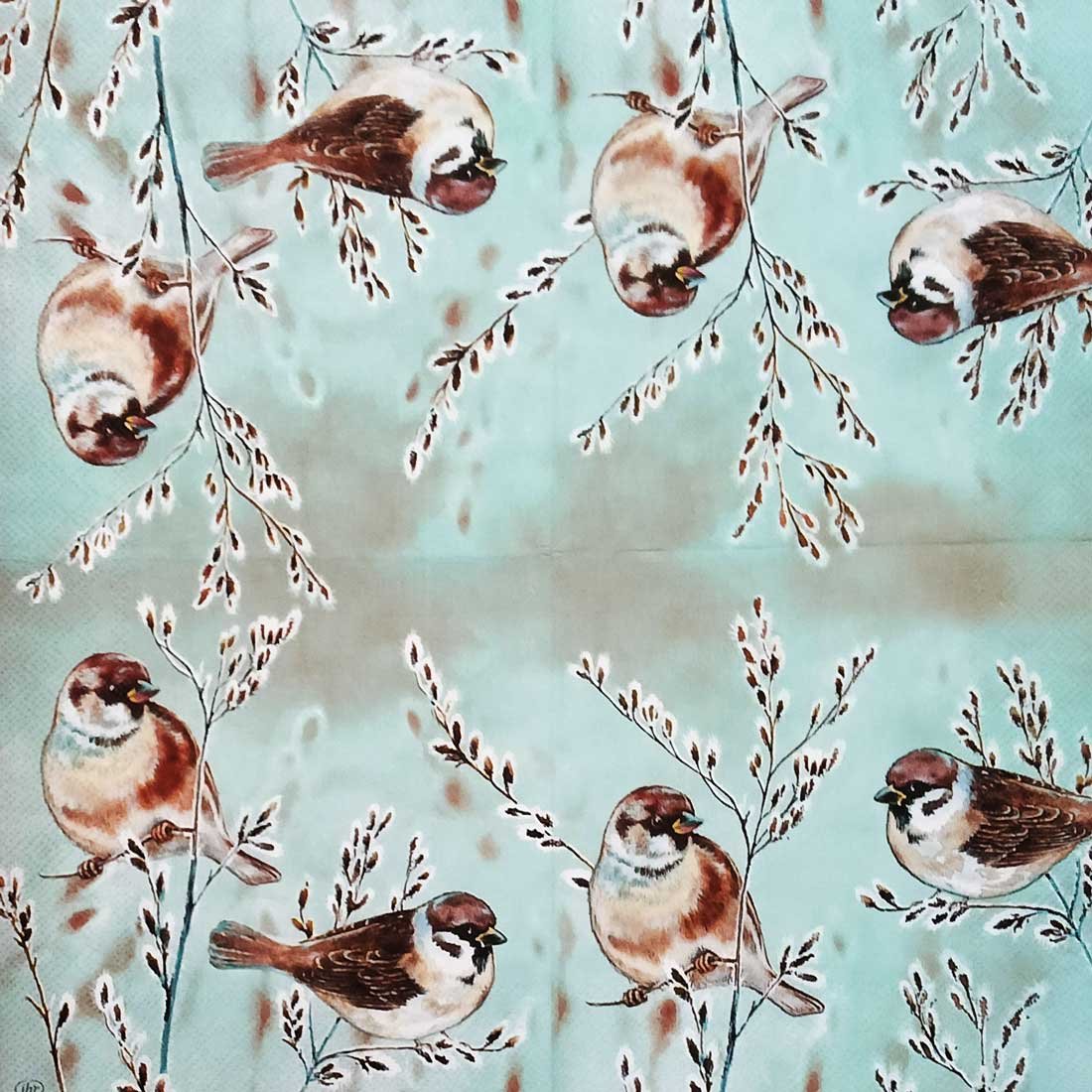 This serene decoupage paper napkin features a delicate watercolor illustration of charming winter birds perched among soft, wispy branches. The gentle brushstrokes and muted tones create a calm, cozy atmosphere, evoking the quiet beauty of a winter morning. Subtle botanical elements and a softly textured background enhance the vintage, hand-painted appeal. This design is perfect for winter décor projects, rustic crafts, farmhouse-style accents, trays, boxes, frames, candles, and seasonal art pieces that call for a peaceful and natural aesthetic.